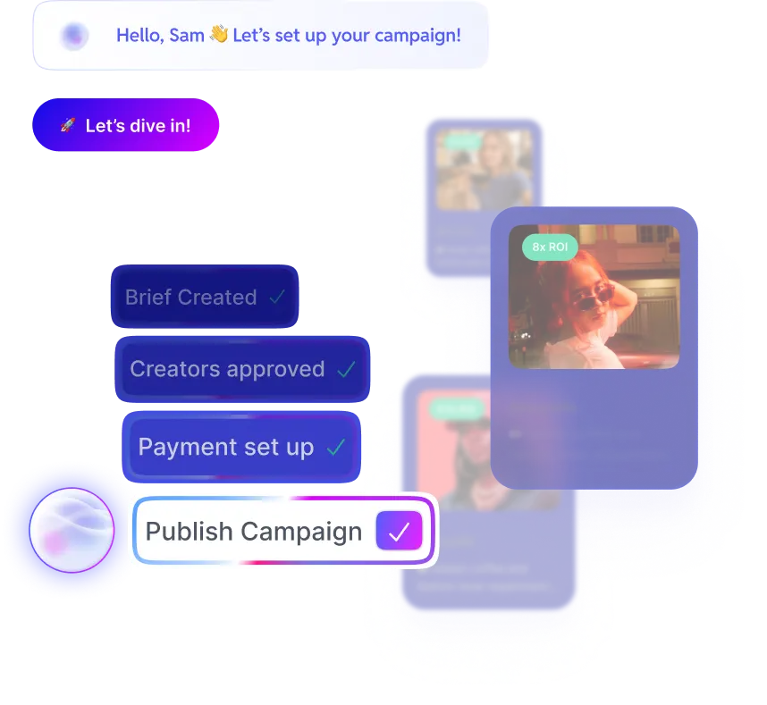 De l’idée à l’exécution en un seul après-midi. Grâce aux candidatures de créateurs en un clic, aux validations en temps réel et aux paiements rapides, votre campagne est en ligne avant que la plupart des équipes n’aient terminé leur réunion de lancement.