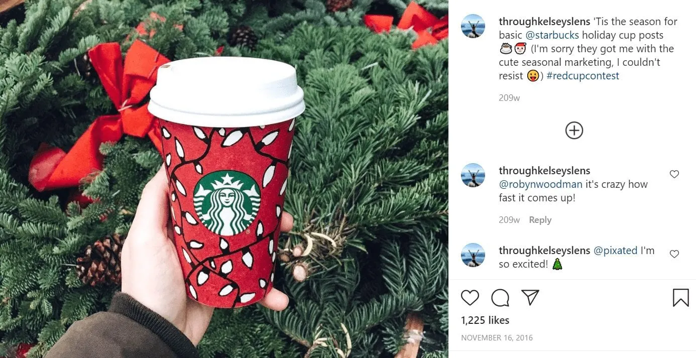 Vous pouvez encourager plus d’interactions en faisant de votre campagne un challenge de marque. Par exemple, Starbucks a utilisé cette idée avec sa campagne saisonnière #RedCupContest qui a duré pendant plusieurs années et a récolté plus de 37,5 k posts sur Instagram de la part de personnes personnalisant leurs mugs Starbucks rouges. Lancer une campagne qui capte l’imagination de votre audience clé est une façon géniale de s’assurer que les personnes commencent à poster et à parler de votre marque en ligne. En conséquence, estimer le niveau de participation à ce genre de campagnes fondées sur du contenu généré par les utilisateurs est une bonne mesure de la notoriété globale de votre marque.