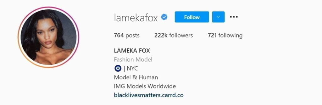 Lameka Fox est une mannequin américaine qui a été repéré sur Instagram par la campagne #WLYG (We Love Your Genes) d’IMG Models. Elle a participé à des défilés pour Tommy Hilfiger et Valentino.