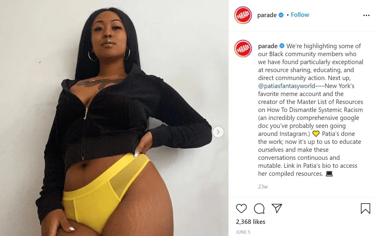 Prenez l’exemple de Parade, une marque de sous-vêtements qui travaille avec des influenceurs abordant fréquemment des sujets de mode inclusive et de justice sociale dans le secteur. Étant donné que l’image de marque de Parade fait écho à son projet de changer le secteur du sous-vêtement, ce type de collaboration est tout à fait logique.