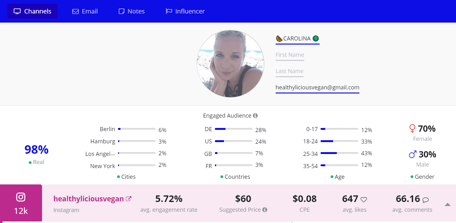 Carolina, a Berlin based vegan food and fitness fanatic shares photos of her creations bursting with color, definitley making a vegan lifestyle look delicious! Her strikingly high engagement rate of 5.27% shows just how reactive her followers are to the combination of creative vegan recipes and fitness posts.