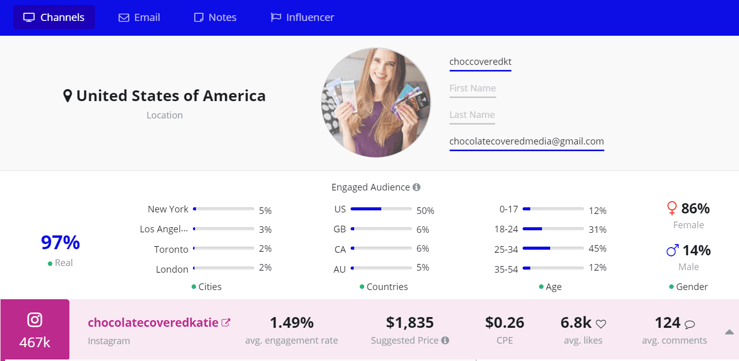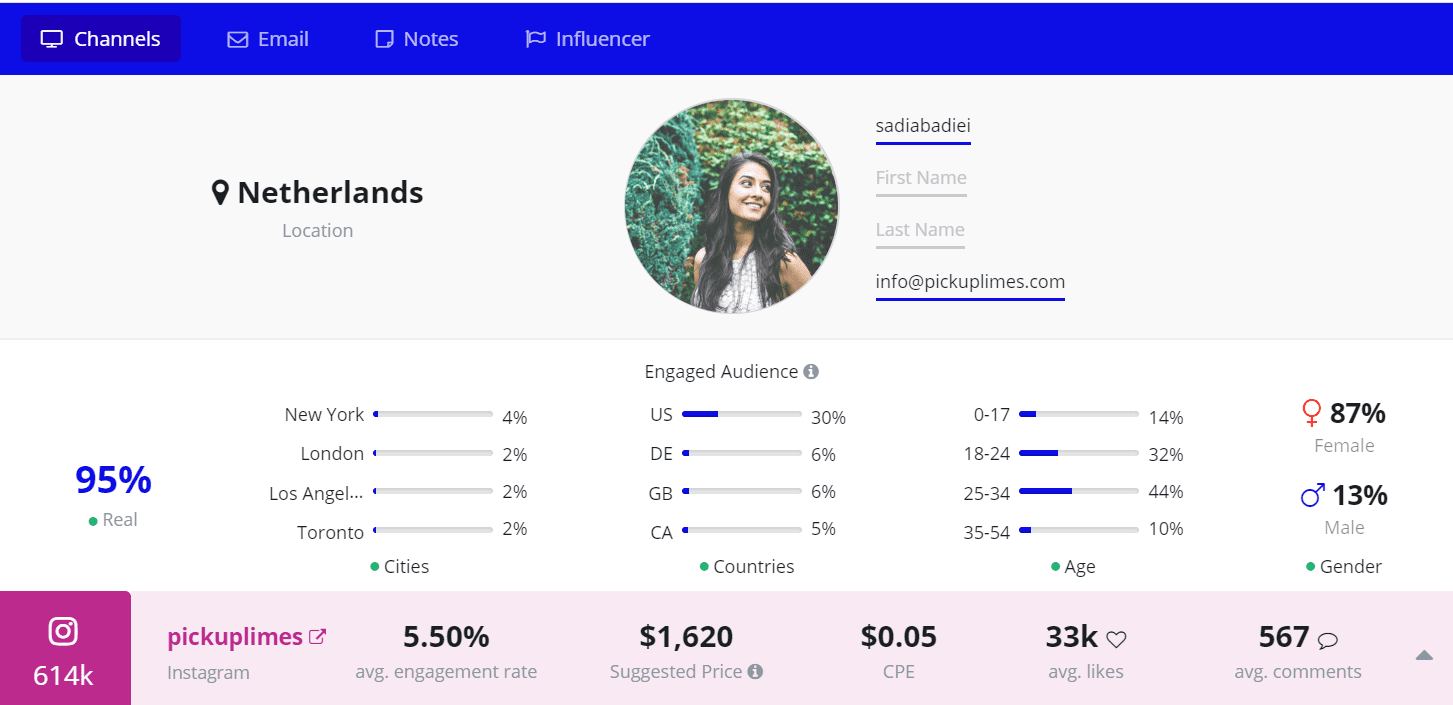 This Canadian lover of life & full-time foodie is based in the Netherlands and has a degree in dietetics. Sadia is pretty insta-famous with 614k followers, yet she’s an even bigger YouTuber with 2.84M subscribers on her channel. Her motto is to nourish the cells and the soul with delicious food and her expert advice. She’s a health advocate through and through with Upfluence A and A+ ratings on her Instagram & YouTube account, showing that she performs excellently compared to similar influencers.