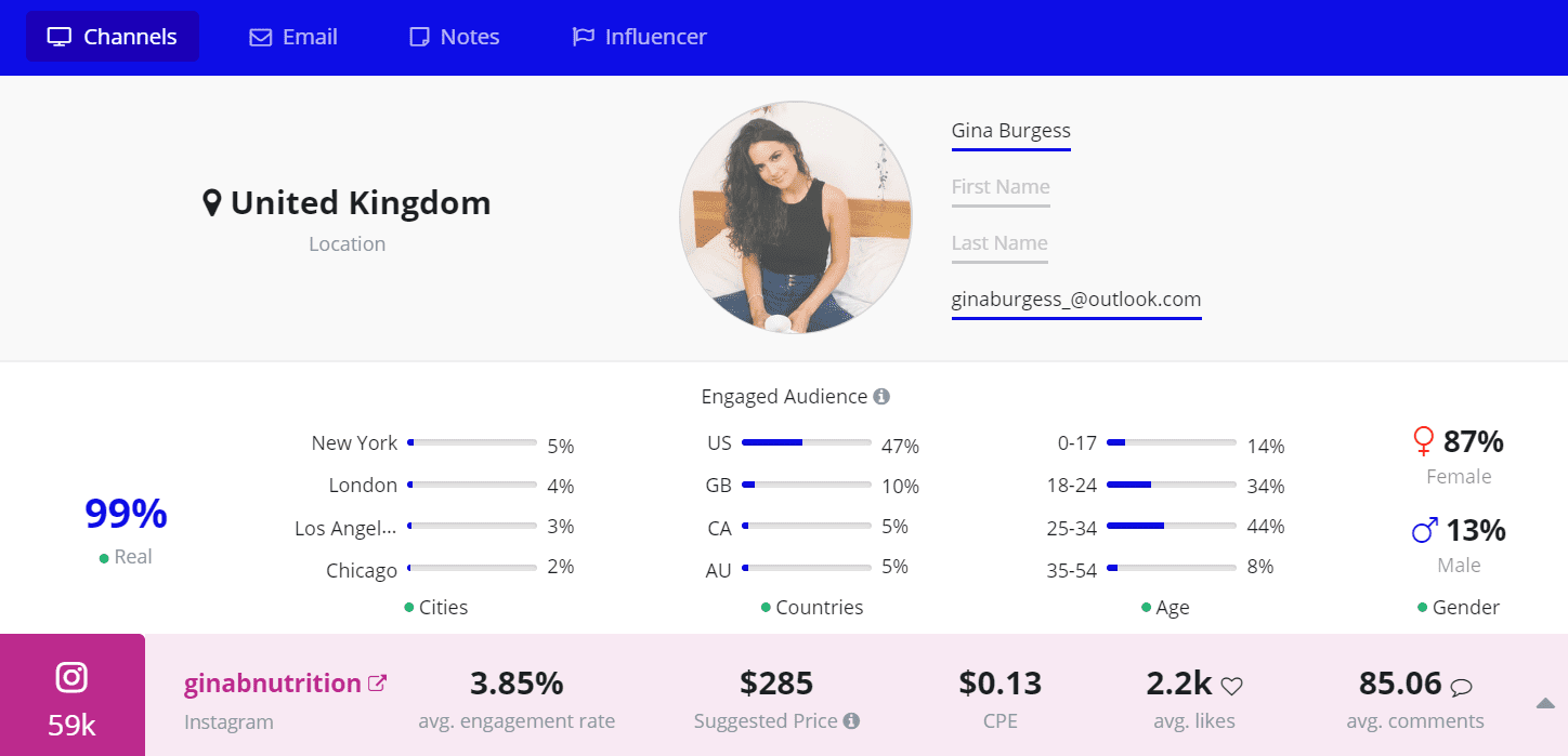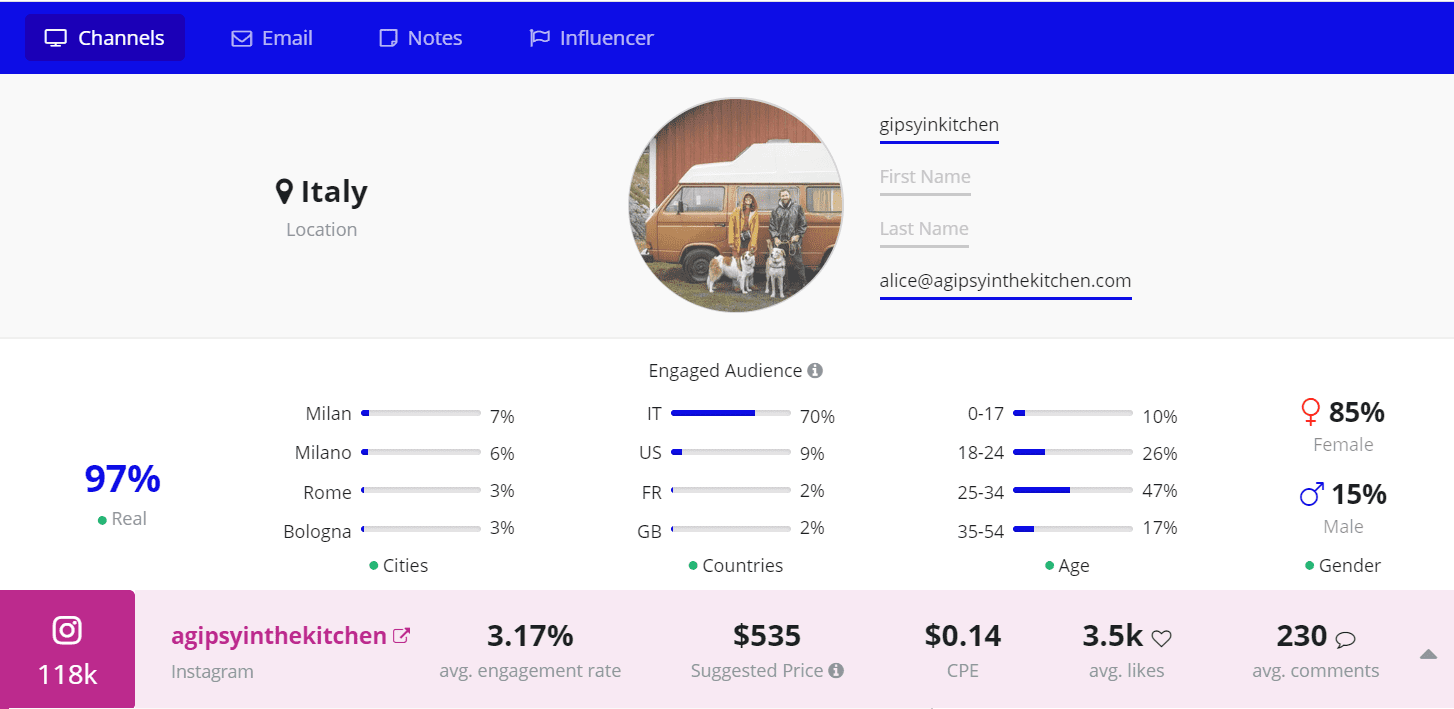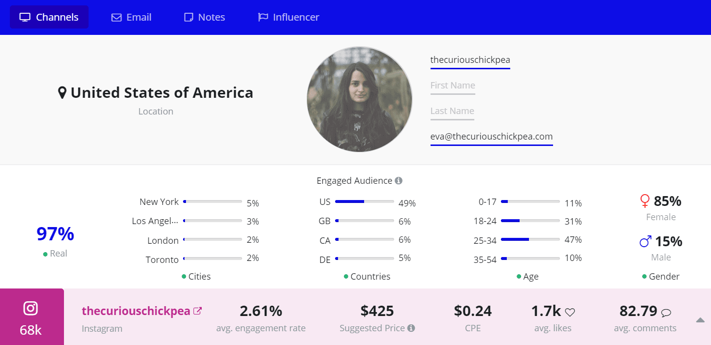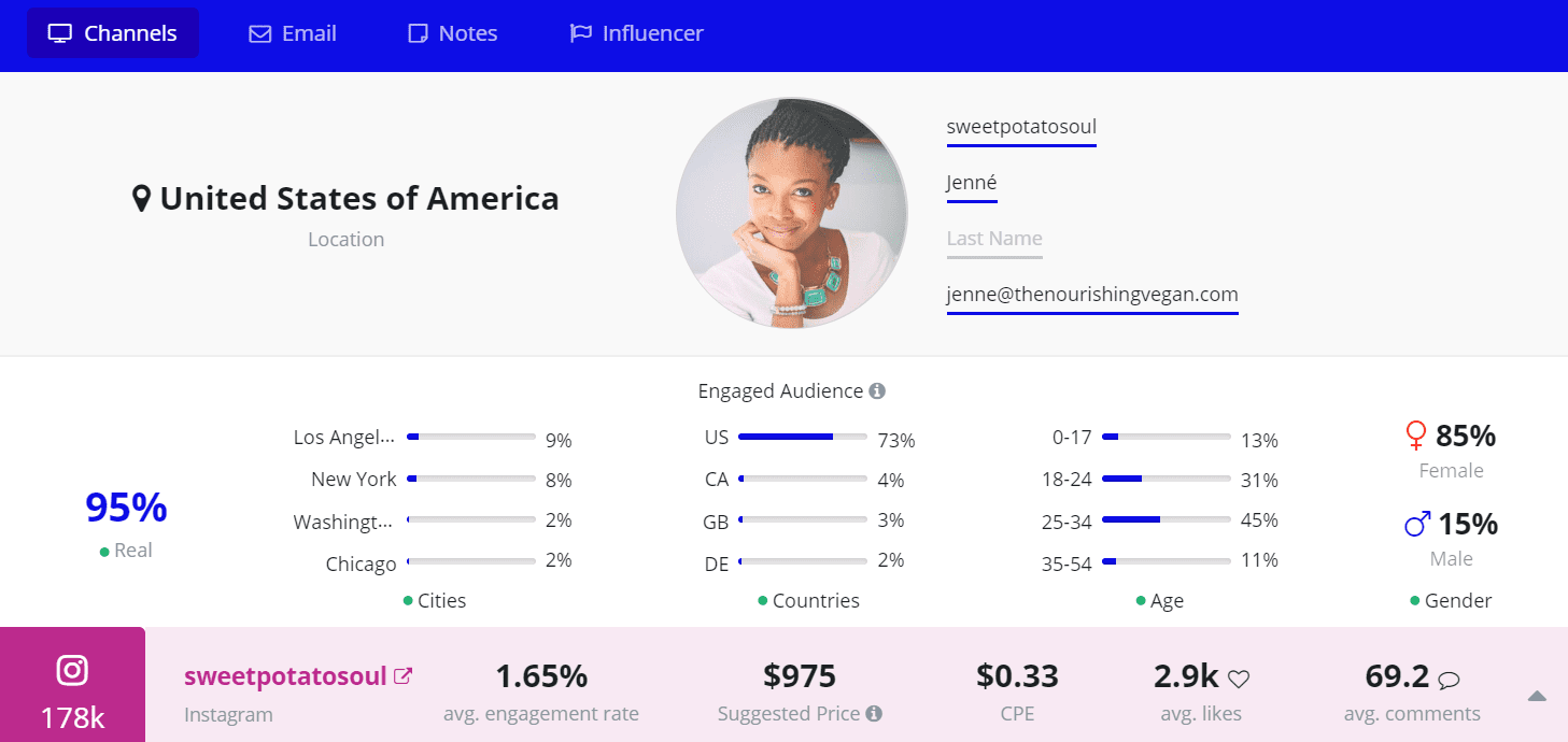 Francesca prides herself in making delicious, plant-based meals. Her Instagram is top-notch, with the majority of her engaged audience based in tha US. All in all, 224k people follow her exciting food journey.