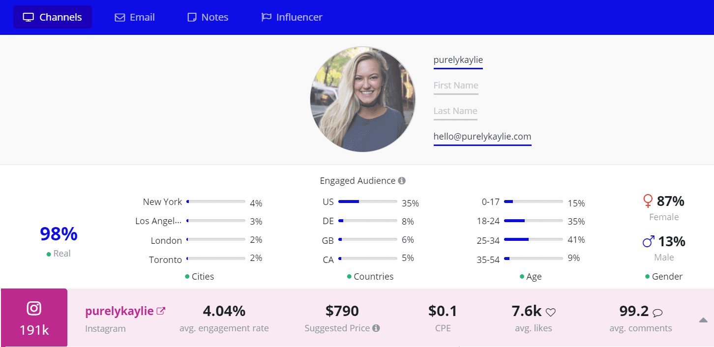 As you can see from the quick overview of her posting frequency in Upfluence, Kaylie is pretty busy on Instagram. Her 191k Insta followers love her delicious fruit bowls which often highlight star ingredients, like chia, hemp seeds, coconut flakes, and a whole lot of dragon fruit. Her e-book features 75 recipes of nutritious, colorful vegan food for breakfast, lunch & dinner. Yum!