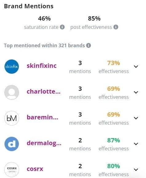 You can identify sponsored content frequency by simply looking through an influencer’s feed. Not a fan of manual work? Upfluence also has a brand mention data collection that shows you how often an influencer mentions brands, which brands they mention, how many times they mention that brand, and how well those branded posts perform compared to their average engagement rate.