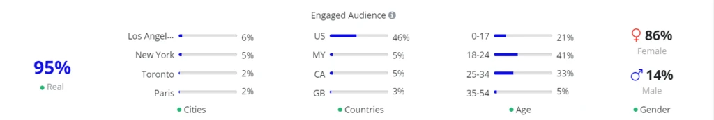 Upfluence detects inauthentic followers based on engaged followers, which are those who directly interact with influencers through likes and comments. So, an influencer with a 3% engagement, and 94% realness should be good to go. Note: It is possible for an influencer to never have bought fake followers to still have “spammy” comments sometimes due to their profiles being public, so anywhere above 90% realness is a positive indicator of an authentic audience.