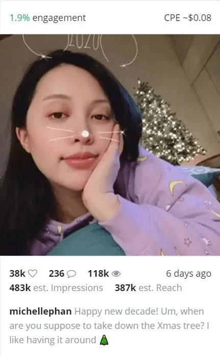 Estimated reach and number of impressions are useful influencer metrics to look at when you want a quick snapshot of a creator’s general impact. However, it’s important to note that because impressions are calculated based on how many times your content has appeared on someone’s feed, it doesn’t guarantee the person has seen the content. For instance, they may close the app before scrolling all the way down to your content.