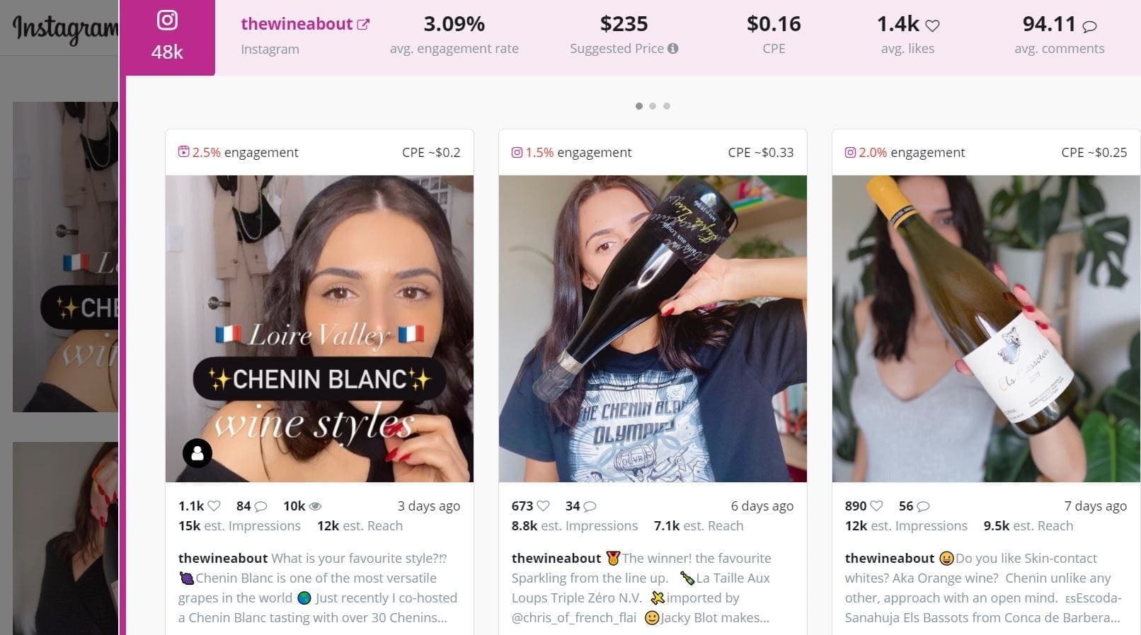 With 48K followers, she’s in the regular/mid-size influencer category. According to Upfluence’s Alcoholic Beverages industry report, this category of influencers usually has a lower engagement rate than micro-influencers.