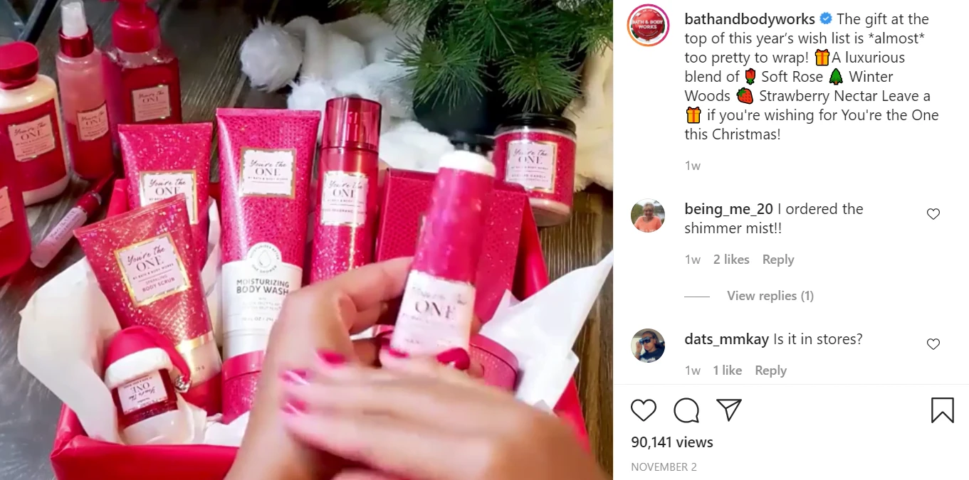 We can look to Bath & Body Works for an excellent example of brand organic content. Through their brand Instagram account, they share seasonal promotions, launch new products, engage with their followers, and share video content. Bath & Body Works recently leveraged short-form video to showcase their seasonal line of beauty products with a quick video demonstrating each product from their holiday hamper. This shows how instrumental video content can be in bringing products to life online.