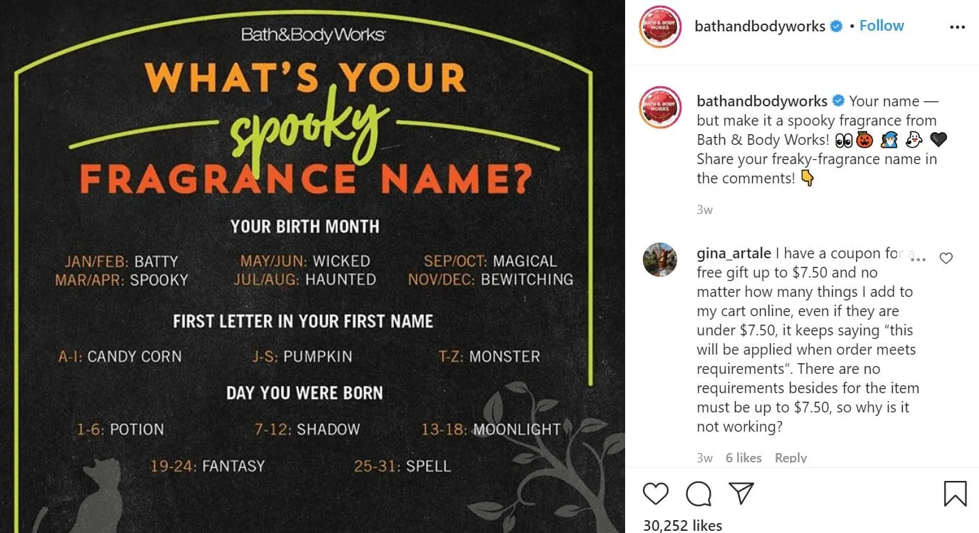 It works so well because the brand has understood exactly what their followers are looking for on Instagram; fun, visual content that gets them excited about the brand’s latest products. They even created their own versions of games and quizzes that are so popular across social media right now, such as choosing your spooky fragrance name which they posted around Halloween. A clear winner for driving engagement!