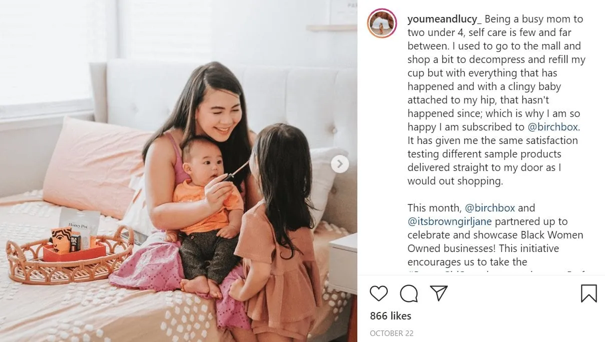 Beauty subscription brand Birchbox has also leveraged influencer partnerships to reach new online audiences to further grow their online influence. As an eCommerce subscription brand, building brand awareness online is key to driving sales. Their recent partnership with @youmeandlucy_ is featured in the top-performing influencer section of the Birchbox Brand Report from Upfluence. The brand has partnered with a mommy and lifestyle influencer in order to reach women in the 25 – 34 age bracket, which we see from their brand report is the biggest age group represented by their followers (41%). This kind of partnership is helping to build brand awareness amongst a strategic online audience demographic which can translate into increased followers, higher engagements and more sales for the brand.