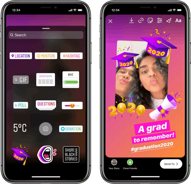 Instagram and Facebook are also giving graduation a make-over. Last week, the platforms released graduation themed AR filters (picture a graduation cap complete with floating confetti), a graduation countdown sticker for Instagram stories, and dedicated Facebook profile frames, setting the scene for the virtual graduation ceremony #Graduation2020 on Facebook Watch at the end of the week. The fun doesn’t stop there, as students across America are invited to take part in interactive challenges on social media during the week, such as sharing an old photo in the throwback #GradPhotoChallenge and doing a graduation walk using #GradWalk2020. During a time that would ordinarily be about making lasting memories with classmates and friends, students adopt a new form of memory-making by taking on these new online challenges and sharing the customized photos with friends and family.