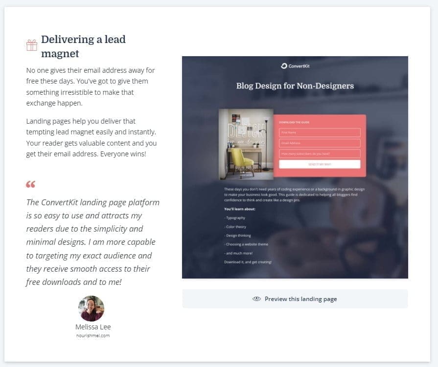 Alongside sharing the bells and whistles of their features, ConvertKit shares successful creator stories to showcase how building an email list can help creators solidify their businesses. Their product pages feature several testimonials from happy customers to encourage leads to try out the email platform’s free trial.