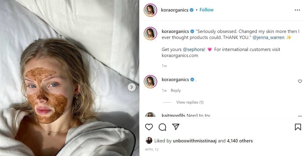 Kora Organics reposts user-generated content to their Instagram feed to show audience members on the fence about buying how much their customers are liking the results of using their skincare products.