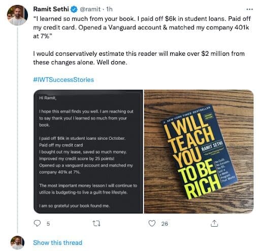 New York Times Bestselling author Ramit Sethi uses feedback from his happy readers to promote book sales on Twitter. He takes book testimonials, shares a screenshot image, and pulls out specific points to share in his 280-character limit tweet. Then, he adds a photo of the book as well to make it clear which of his products the testimonial is talking about.