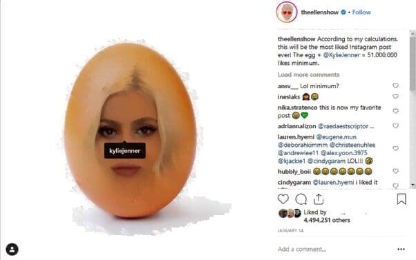 Ellen, from The Ellen Show, also posted a photo of the egg on Jan 14th with Kylie Jenner’s face on it. Celebrities and fans alike commented and shared the post, further extending the reach of the egg.