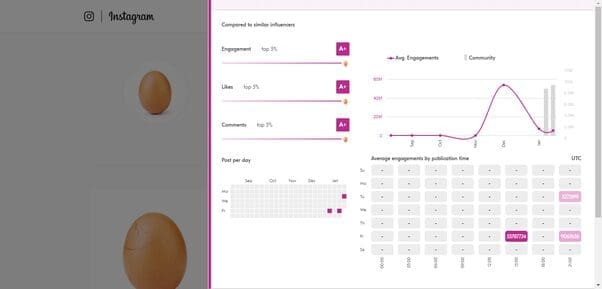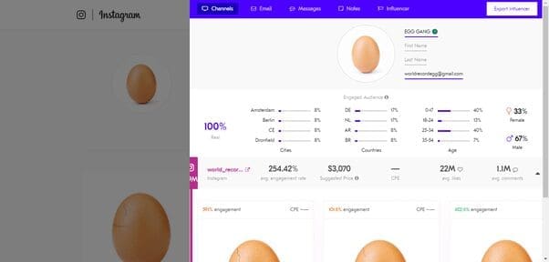Using the (free) Upfluence plugin for Chrome, we can see the Egg’s audience analytics, engagement rates per post, and contact information.