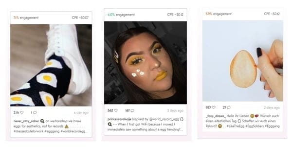 The egg has inspired many spin-offs around the world… these posts were found by tracking related hashtags like #eggsoldiers with the social listening tool by Upfluence.