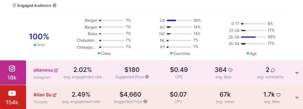 Allan Su creates travel video itineraries for different places including Japan, the Faroe Islands, and Iceland that he posts on YouTube. With 154K subscribers on YouTube, he could boost your brand’s reach!