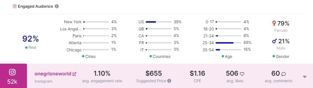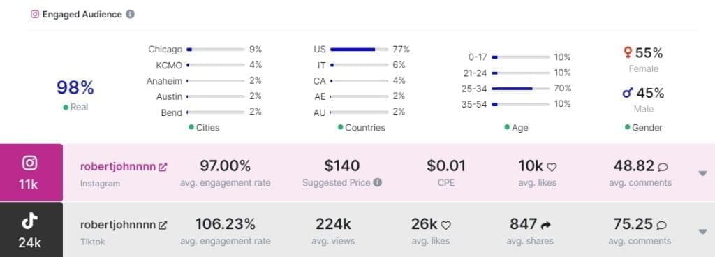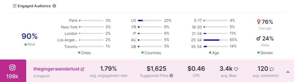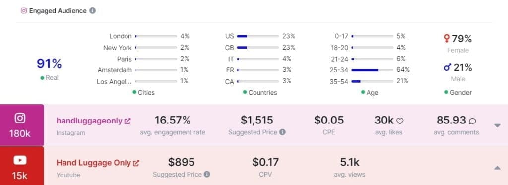 Robert specializes in sharing tips and ideas of Airbnb’s he’s stayed in and hiking routes around the USA and Canada. If you’re targeting a US audience, he could be a great choice for your brand with 77% of his audience based in the US.
