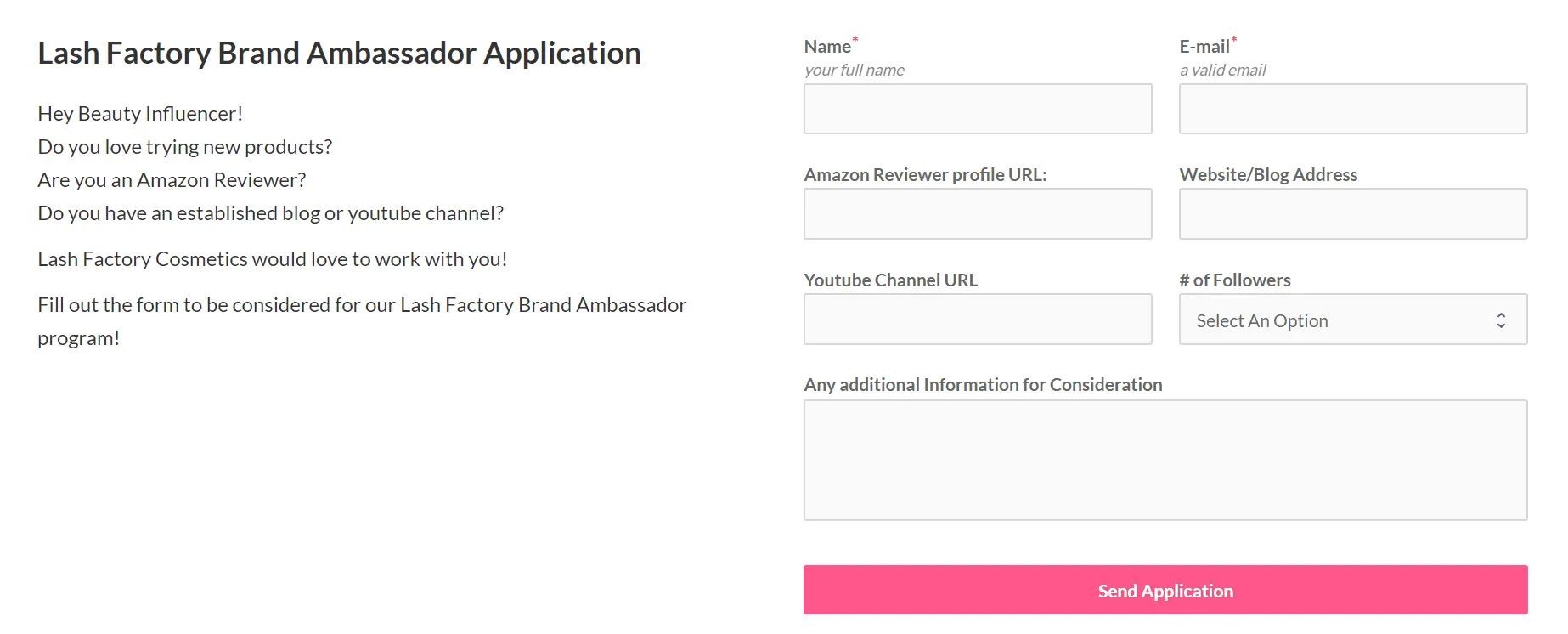 Another take on the typical incentive-driven pop-up is to have an open application form for customers to enter their details. This is most commonly used as a way to recruit brand ambassadors. It acts as a natural filter as only motivated customers would be interested in signing up for a brand ambassador program. Brands can use this as part of a tiered ambassador program with different levels of commitment and rewards. By including fields such as social media handle in the form, brands can analyze and select their most influential customers to work with as influencers and affiliates whilst working with their larger customer base on a referral basis.