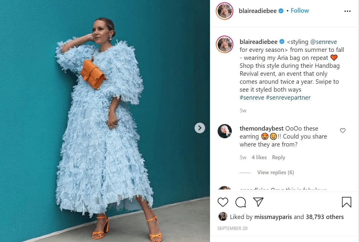 In September, their follower numbers continued to grow which coincided with increased influencer activity. Fashion mega-influencer @blaireadiebee (1.6M followers) posted a photo wearing a Senreve handbag. She tagged the brand’s account in her post, giving the brand strong visibility to her audience which likely contributed to the boost in new followers around that time. Not to mention, the brand leveraged this content by reposting the influencer’s image to its own account.