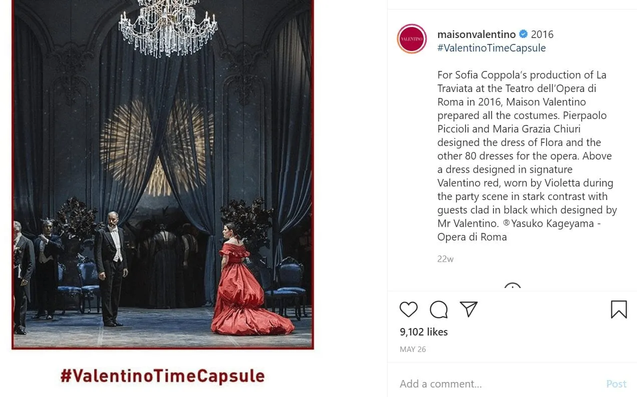The Upfluence Brand Influence Ranking cites Valentino as one of the top 5 brands for engagement on Instagram, with a particular peak in May 2020. A closer look at their brand content during this time highlights strategies that other brands can adopt. During the height of the coronavirus pandemic, the brand latched onto people’s longing for better times and posted a series of nostalgic, iconic photos using the hashtag #ValentinoTimeCapsule. The posts showed iconic imagery that generated a lot of engagement amongst their audience.