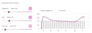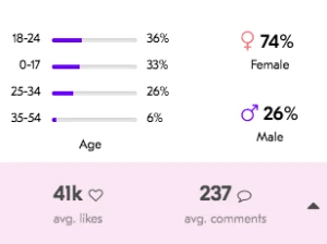Now, we mentioned earlier Arii became famous on the app Musical.ly (now Tik Tok), an app geared towards teens. A quick look at Upfluence software showed us that just about 70% of her audience is under the age of 24…and, 33% were under the age of 18. What does that tell us? A large chunk of her audience are teens that have no to limited purchasing power! And while Arii’s followers are 95% real, many of them are passive. Arii’s Instagram posts generally get 41K likes and only 237 comments. Especially, the number of comments is a dead giveaway that Arii’s Instagram account has lots of passive followers. In fact, Arii scores D ratings for likes and engagement, and even an F for comments.