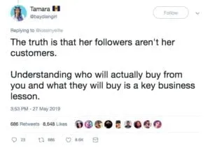 Tamara here hit the nail on the head. If only followers turned into customers by default, that sure would be nice. But sadly, that’s not how it works. Having a ton of followers doesn’t mean they’ll convert into sales. A number is just that – a number. Especially for large accounts with millions of followers, it would be naive to assume they’d all love the brand, right? You need to look for the subset of people in your audience that actually identify with what you’re selling!