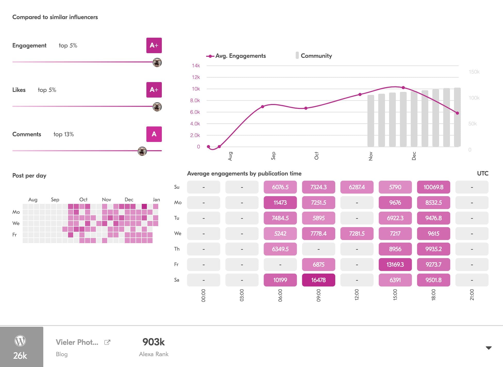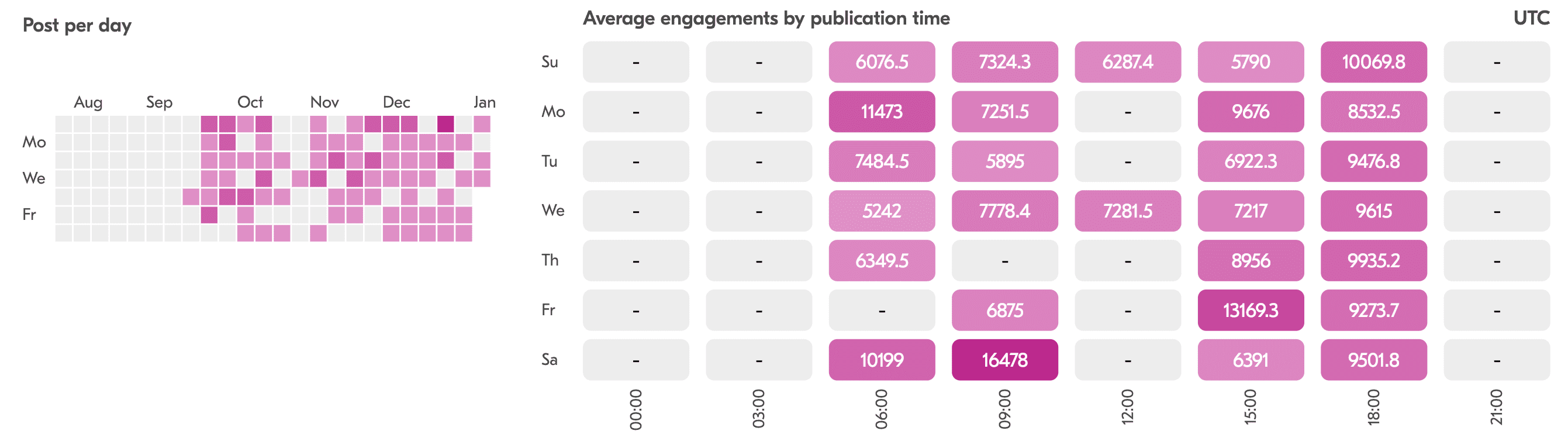 Finally, using a combination of the Posts per day and Average engagements by publication time graphs, you’ll have greater insight into when you and your influencer should consider posting for maximum exposure.