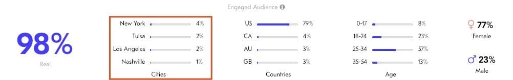 Starting with the Influencer’s Audience Data, Upfluence now provides you with the ability to view their current followers by not only their country but also their top cities. Functionality that becomes extremely important when more defined decisions need to be made for targeting specific groups of people for specific campaigns.